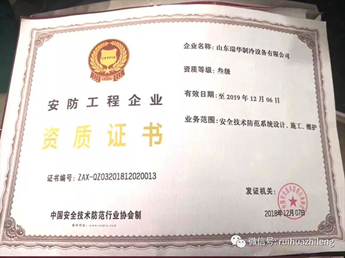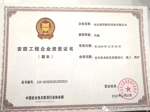 近日,瑞華制冷再獲兩項殊榮,中國肉類協會第六屆理事單位、張總任中國肉類協會第六屆理事。同時瑞華制冷通過考核,獲得中國安全技術防范行業協會頒發的安防工程企業資質證書,涉及制冷行業范圍內的安全技術防范體系設計、施工及維護。
